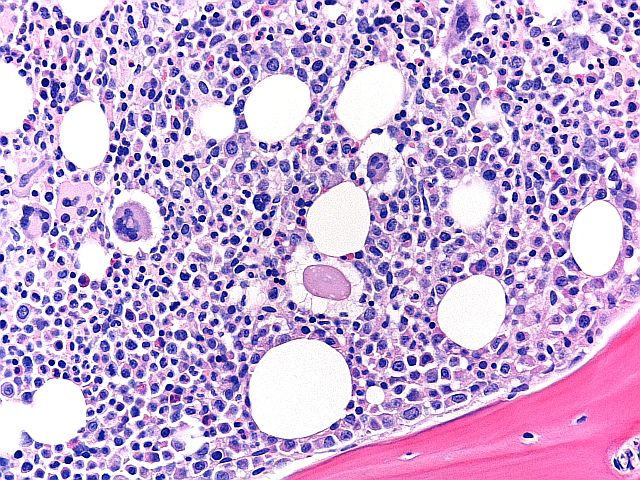 This is an excellent preparation of a BMT biopsy, with balanced H&E staining, good chromatin detail, and selective staining of cell types within the bone marrow tissue. This slide was scored 9/10 at assessment.