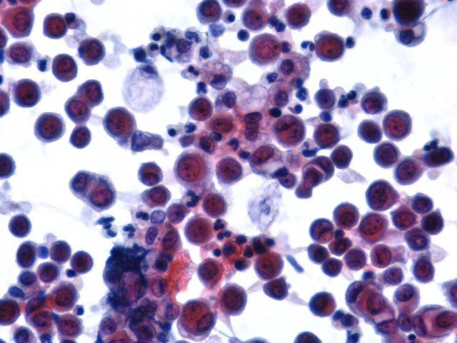 This slide shows a mono layer of cells, no overlapping or clumping and excellent demonstration of chromatin detail. This slide scored 10/10 at assessment.