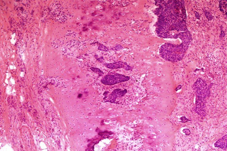 Here's a H+E slide showing basal cell carcinmoa invasion into cartilage from tissue taken from the nasal bridge are. Marks were deducted for: Eosin intensity too string, knife marks, folds and creases. This slide scored 7/10 at assessment.