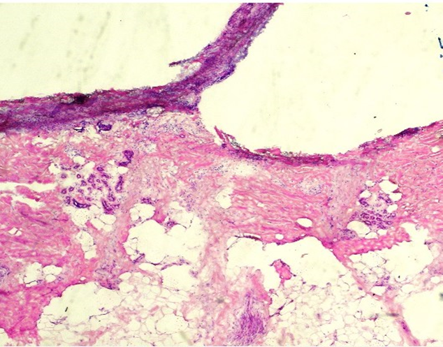 Seen at x4, this is an example of a Haematoxylin & Eosin stained slide. In addition to the folds, creases and lifting, marks were also deducted for Haematoxylin background staining and weak eosin intensity.