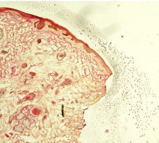 Seen at x4 magnification, heres a slide from the Mohs scheme. Marks were deducted for: folds and creases, knife debris, holes, trimming artefact, squames and floaters, eneven staining and water present. This slide scored 5/10 at assessment.