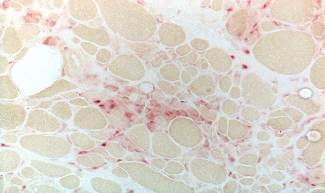 This is example of a poorly executed preparation followed by poor staining. As is with all fresh muscle staining methods, good preperation is key. If your lab is having difficulties you can access Best Methods Protocols and additional quality control assessments.