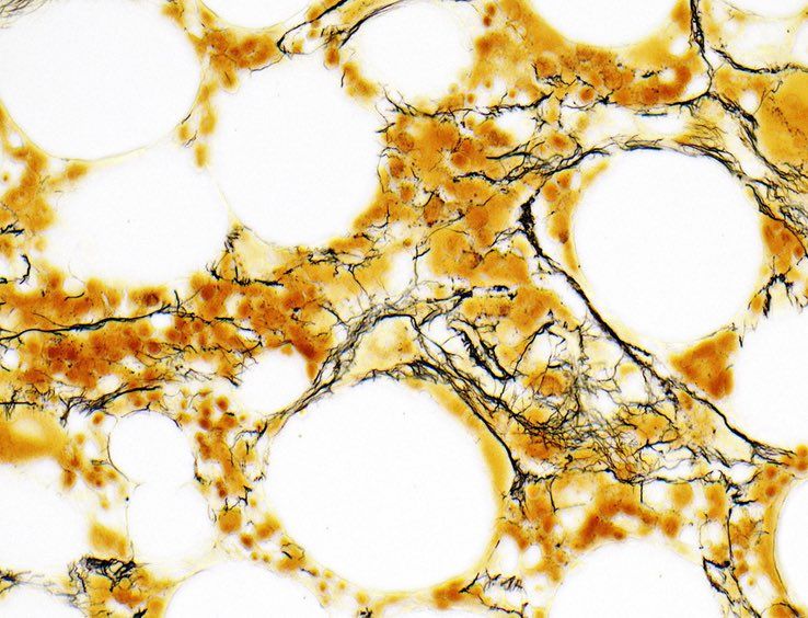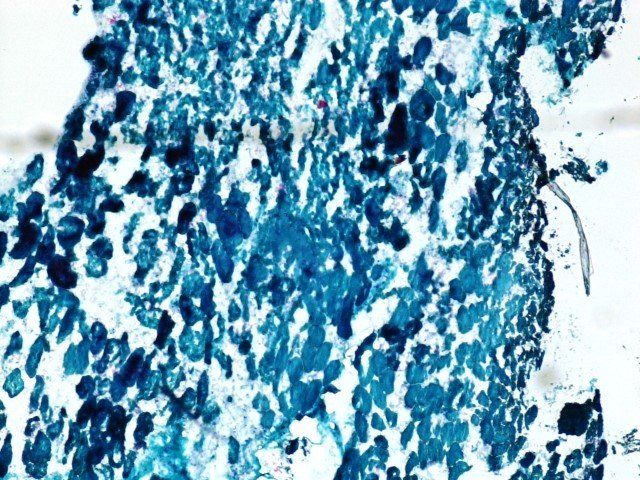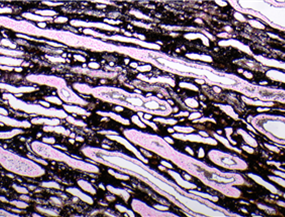Here’s a slide from the BMT scheme. Marks were deducted for background staining and non specific silver deposit which are masking the demonstration of the fibres. This slide scored 5/10.