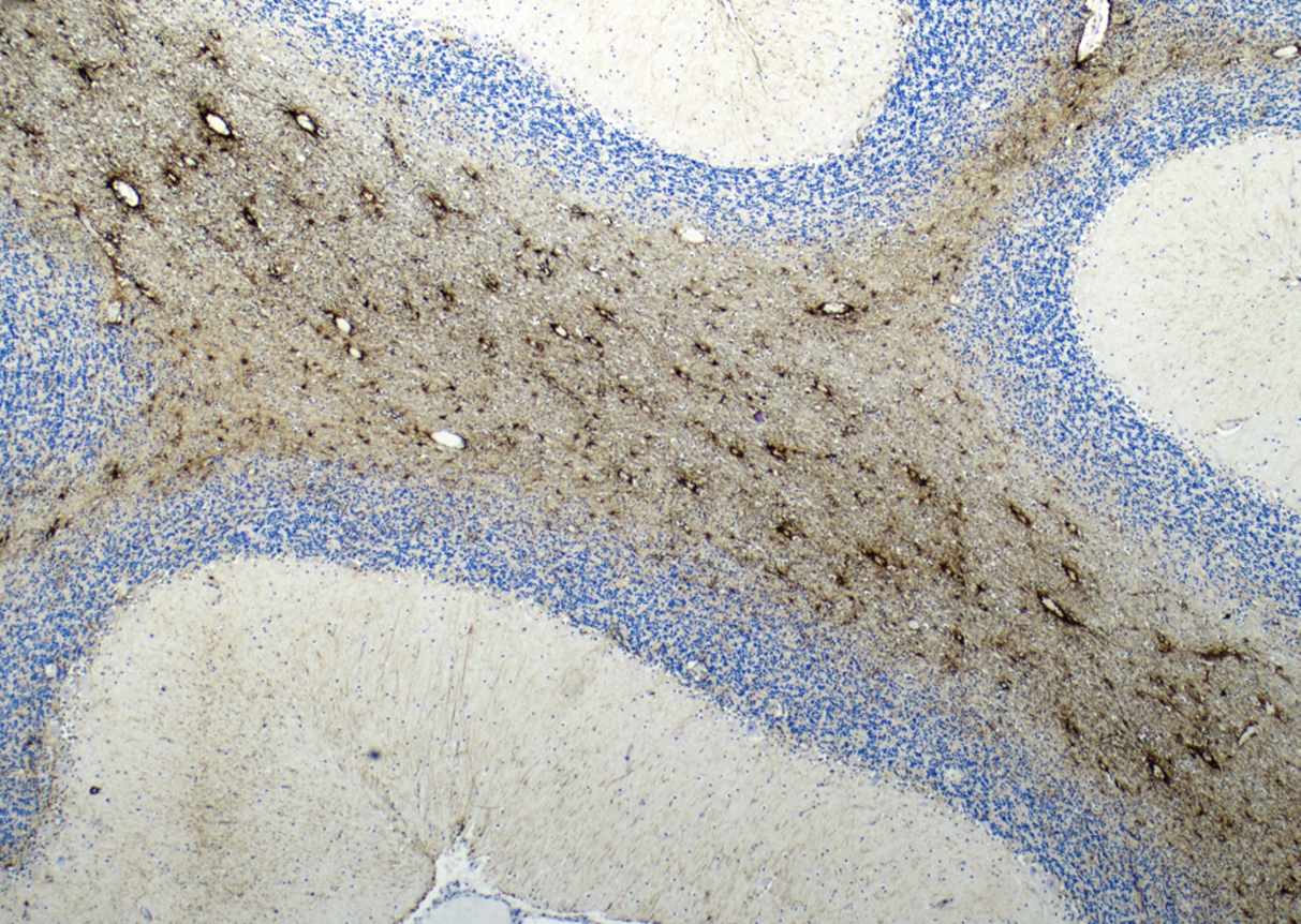 Seen at x20, this is an example of a technique for th demonstration of glail fibres. The staining seen here is suboptimal with weak fibres. This scored 7/10.