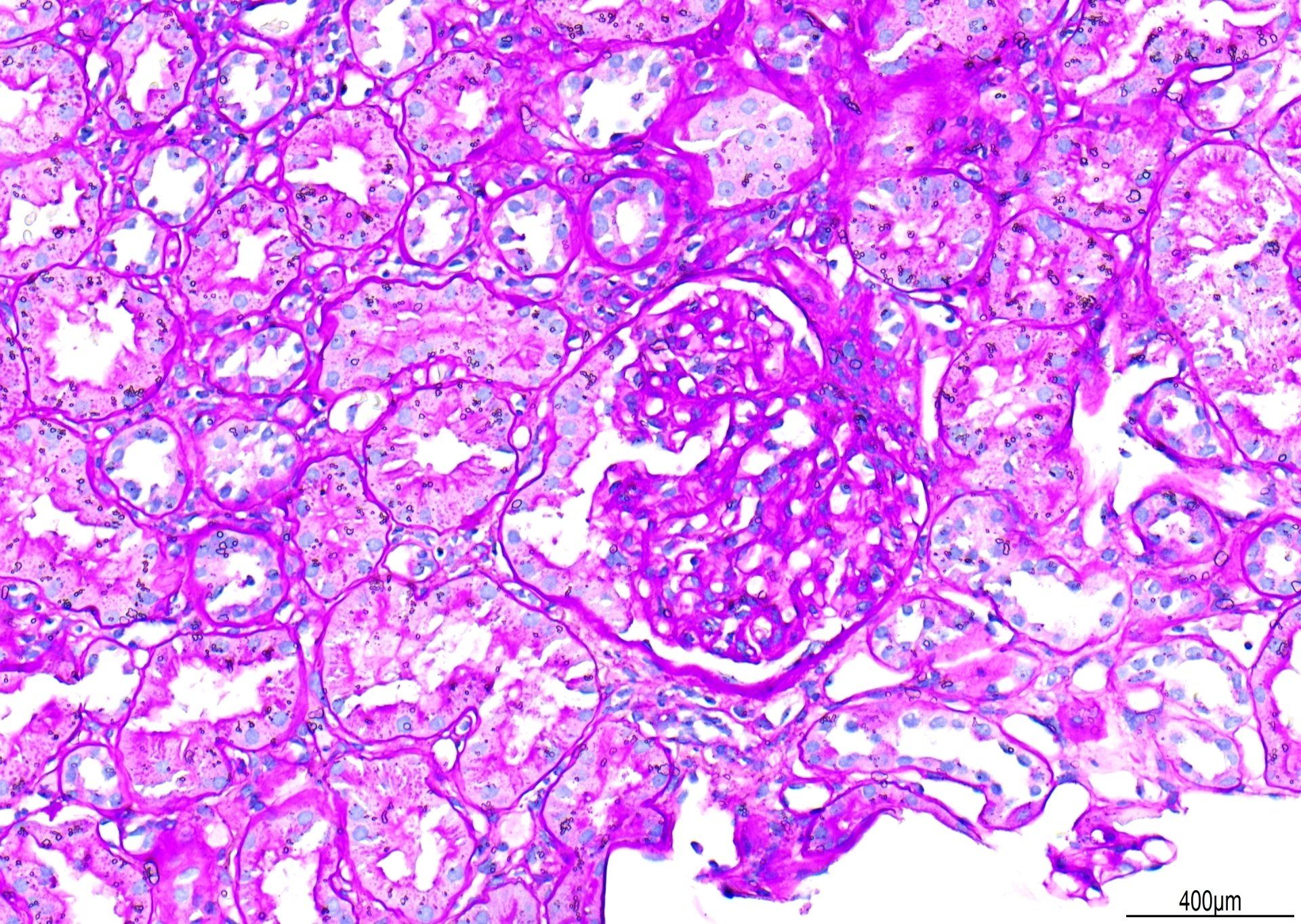 Gesien by x20, is dit 'n voorbeeld van 'n PAS-kleuring. Punte is afgetrek vir 'primêre agtergrondkleuring'. Alhoewel die glomerulêre basale membrane goed gekleur is, kan die kontras beter wees as daar minder agtergrond Schiff-kleuring was. Daarbenewens is waterdruppels onder die dekglas gesien. Die algehele telling vir hierdie afdeling het 7/10 behaal.