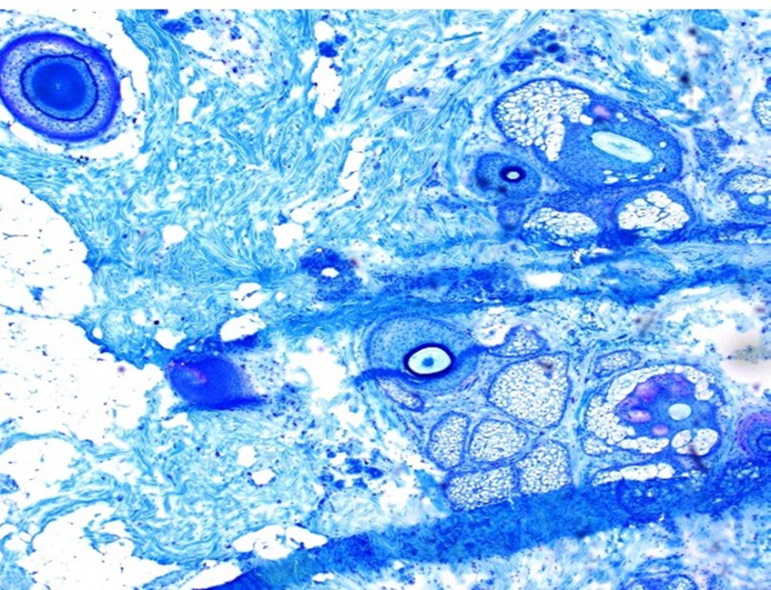 Here’s a slide from the BMT scheme. Marks were deducted for background staining and non specific silver deposit which are masking the demonstration of the fibres. This slide scored 5/10.