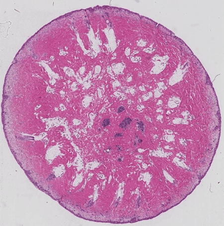 Here's a H+E slide showing basal cell carcinmoa invasion into cartilage from tissue taken from the nasal bridge are. Marks were deducted for: Eosin intensity too string, knife marks, folds and creases. This slide scored 7/10 at assessment.