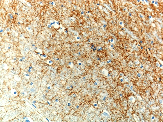 Seen at x20, this is an example of a technique for th demonstration of glail fibres. The staining seen here is suboptimal with weak fibres. This scored 7/10.